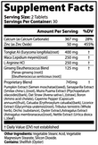 Ingredients: Calcium (as Calcium Carbonate), Zinc (as Zinc Oxide), Tongkat Ali root, Maca root, L-Arginine HCL, Ginseng Eleutherococcus Blend (Panax Ginseng, Eleutherococcus Senticosus), Proprietary Blend (Pumpkin Extract, Sarsaparilla Extract, Muira Puama Extract, Oat Straw, Boron, Cayenne Pepper, Catuaba, Licorice Extract, Tribulus Terrestris, Orchic, Oyster Extract, Astragalus Extract, Nettle Extract), Vegetable Stearic Acid, Vegetable Magnesium Stearate, Silicon Dioxide.